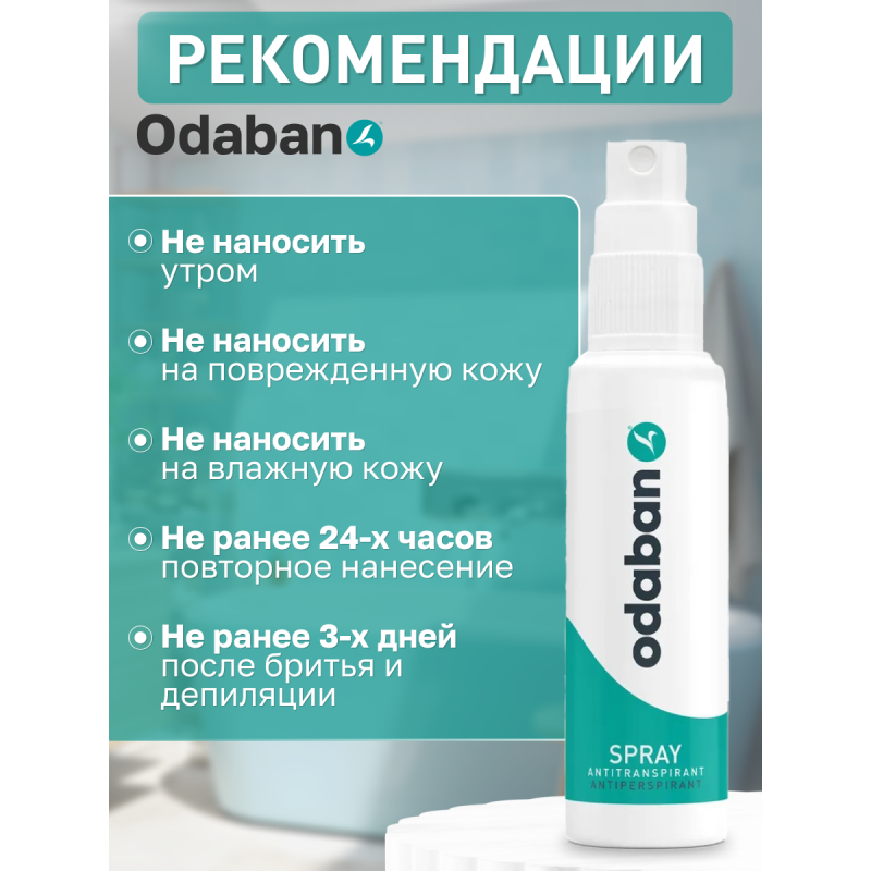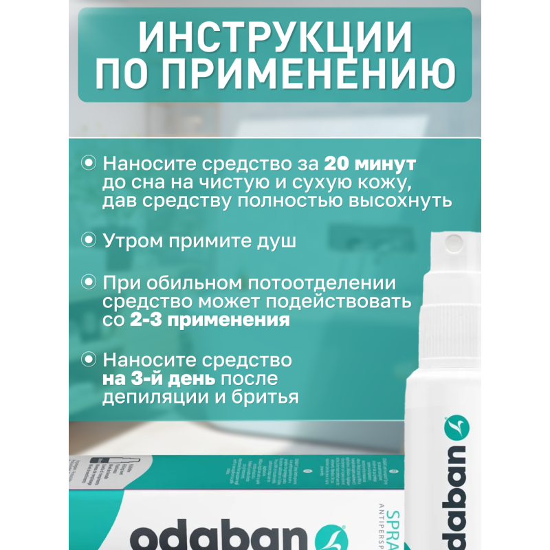 Способ применения: Антиперспирант Одабан в форме спрея предназначен для нанесения на любые участки тела, в том числе и на лицо. Потоотделение заметно снижается уже после первого применения, а при регулярном использовании на ночь спрея-антиперспиранта достигается устойчивый положительный результат.